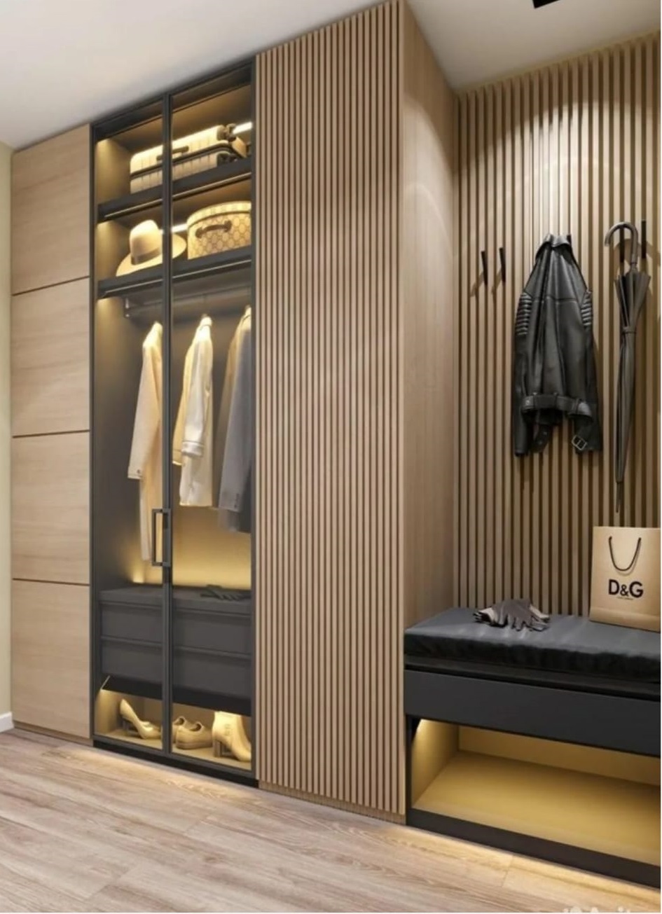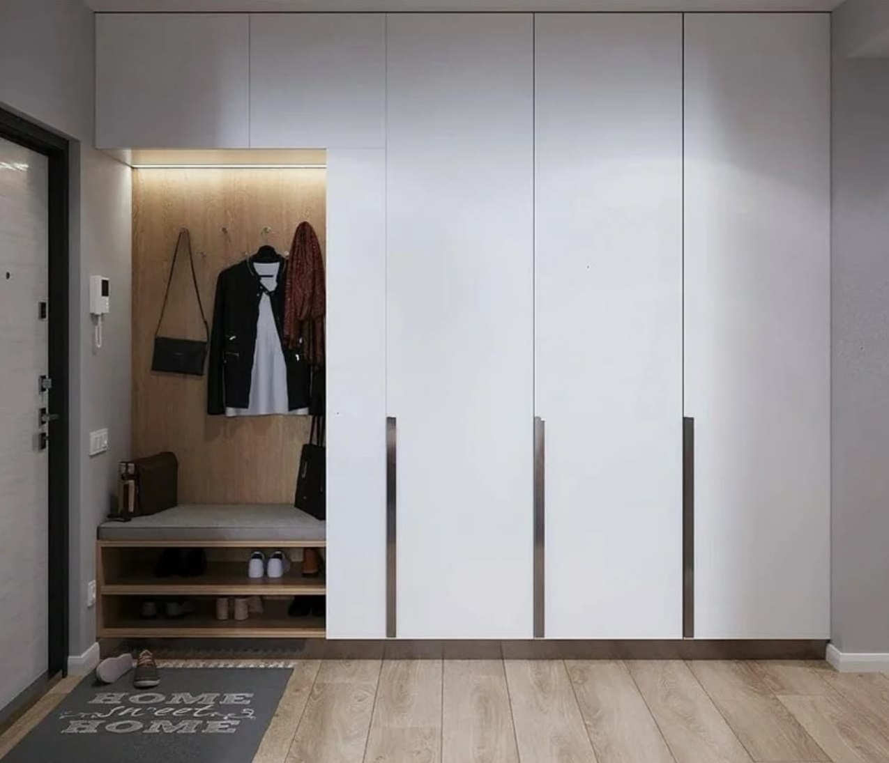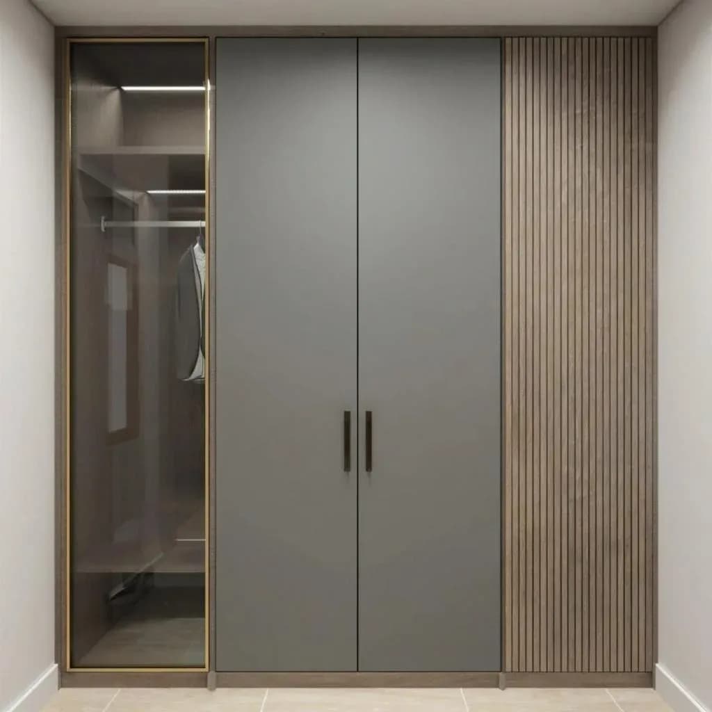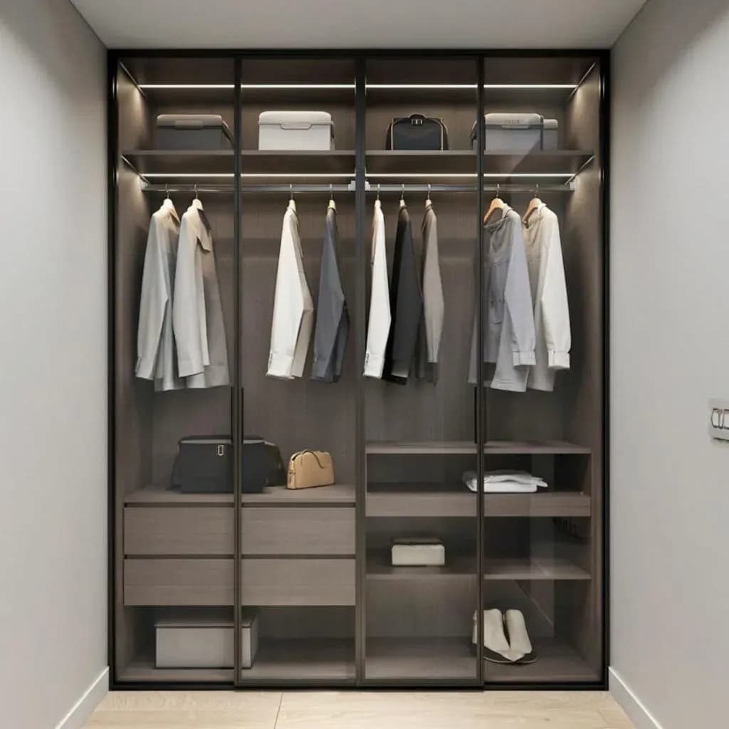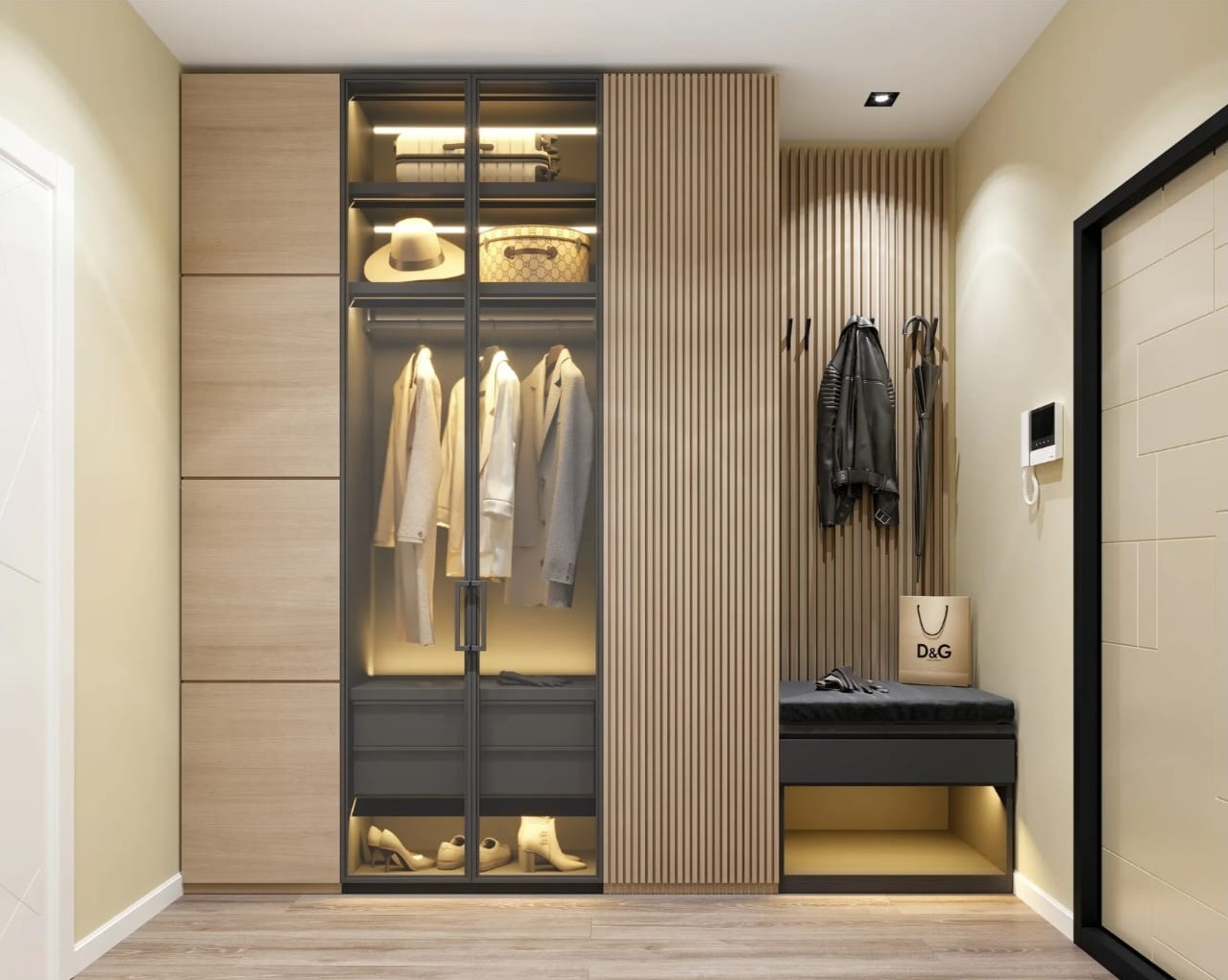 Элегантный шкаф с алюминиевым профилем и стеклянными элементами для стильной прихожей.