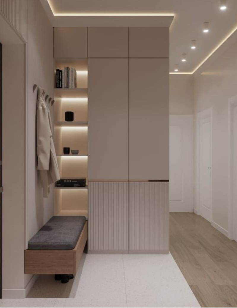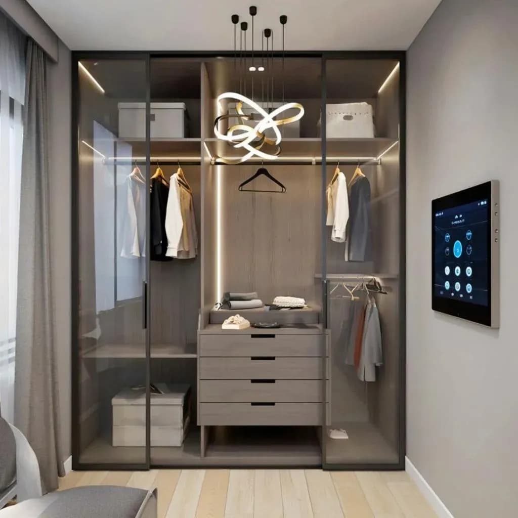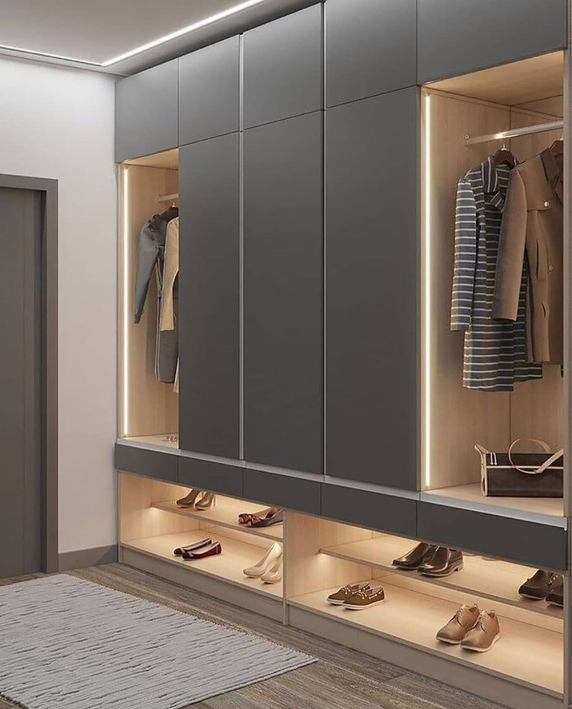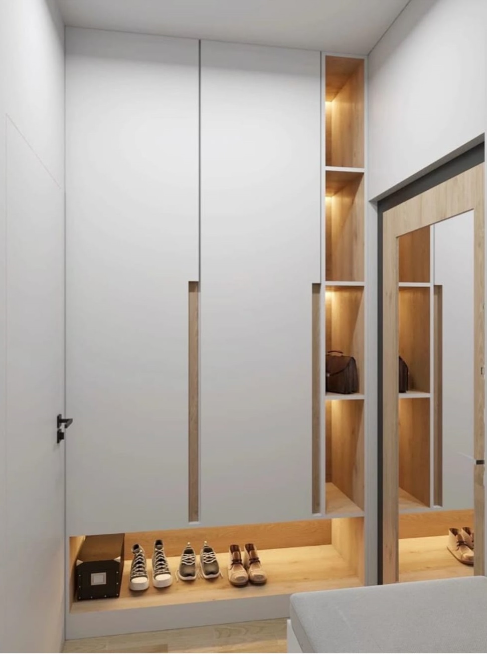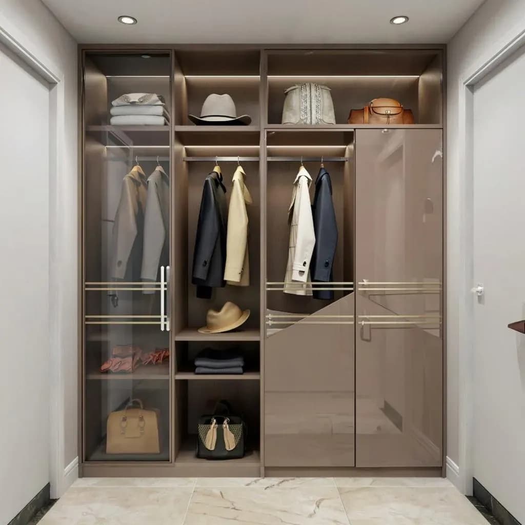 Элегантный шкаф с алюминиевым профилем и стеклянными элементами для стильной прихожей.