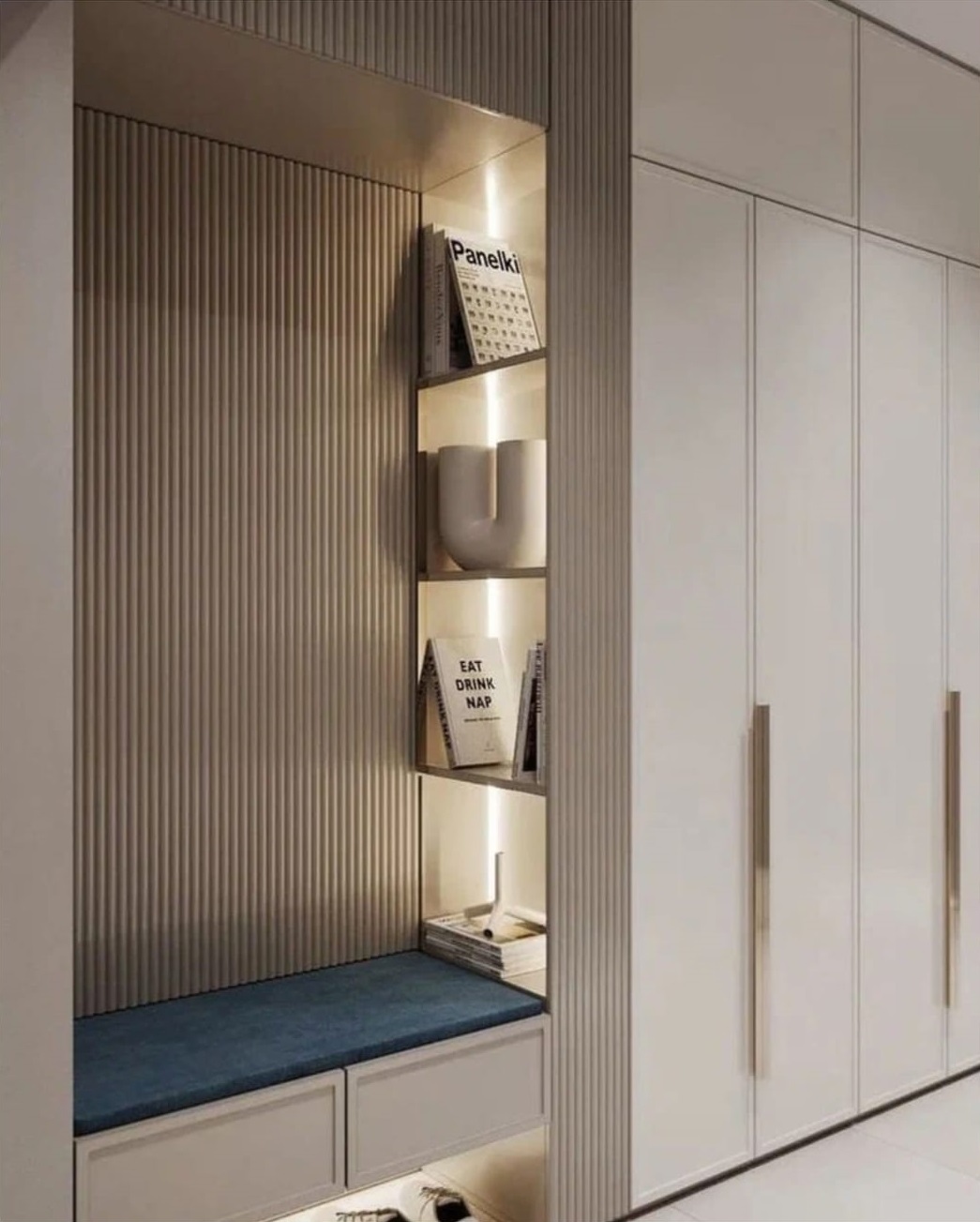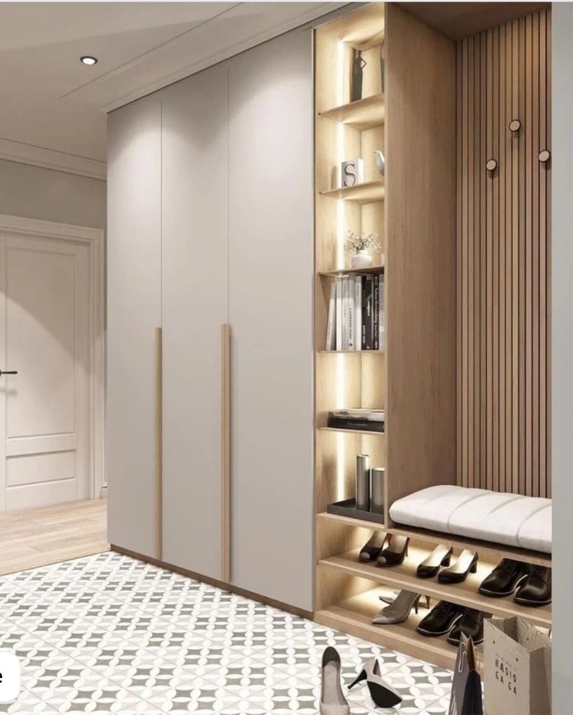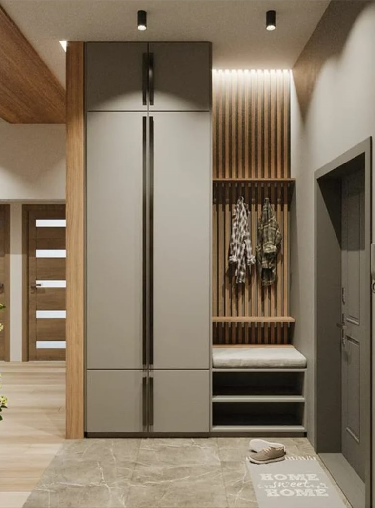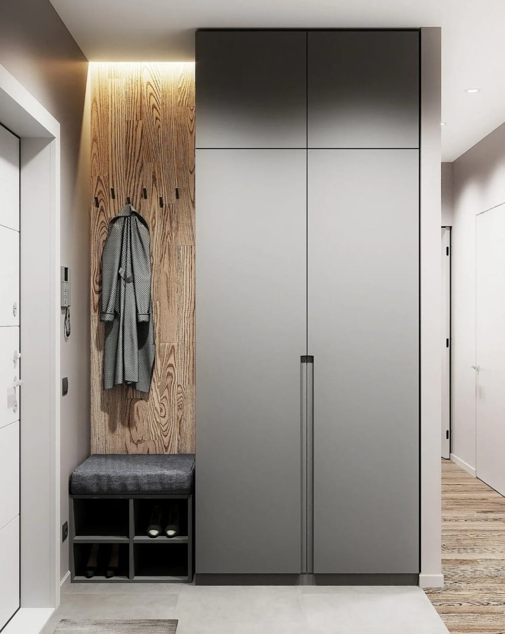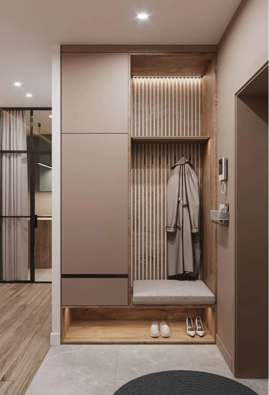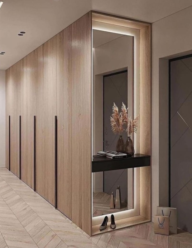 Элегантный шкаф с алюминиевым профилем и стеклянными элементами для стильной прихожей.